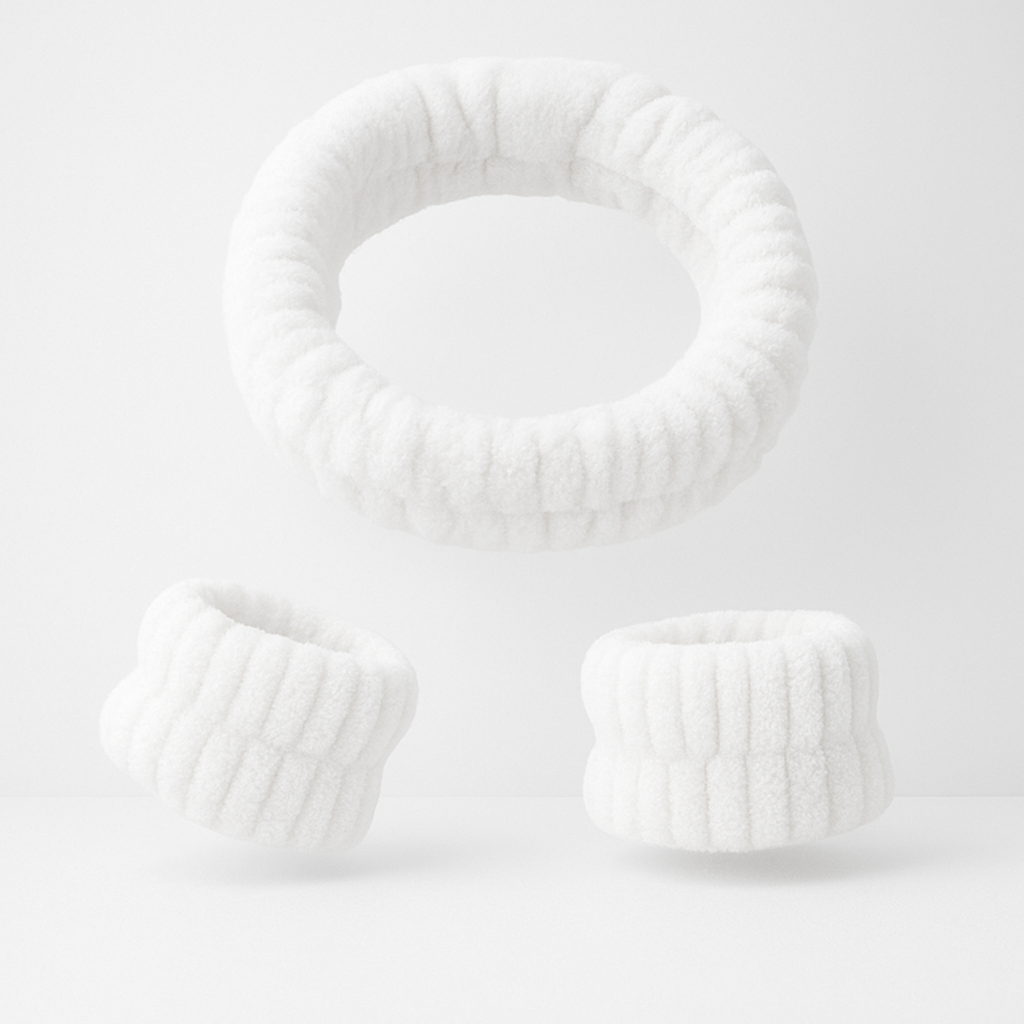 O Kit Hairband e Pulseiras protetoras foi desenvolvido para tornar sua rotina de skincare mais prática, confortável e sem bagunça. A hairband mantém os cabelos afastados do rosto, enquanto as pulseiras impedem que a água escorra pelos braços durante a limpeza facial. Confeccionados em tecido macio e felpudo, garantem absorção eficiente e um toque agradável à pele.